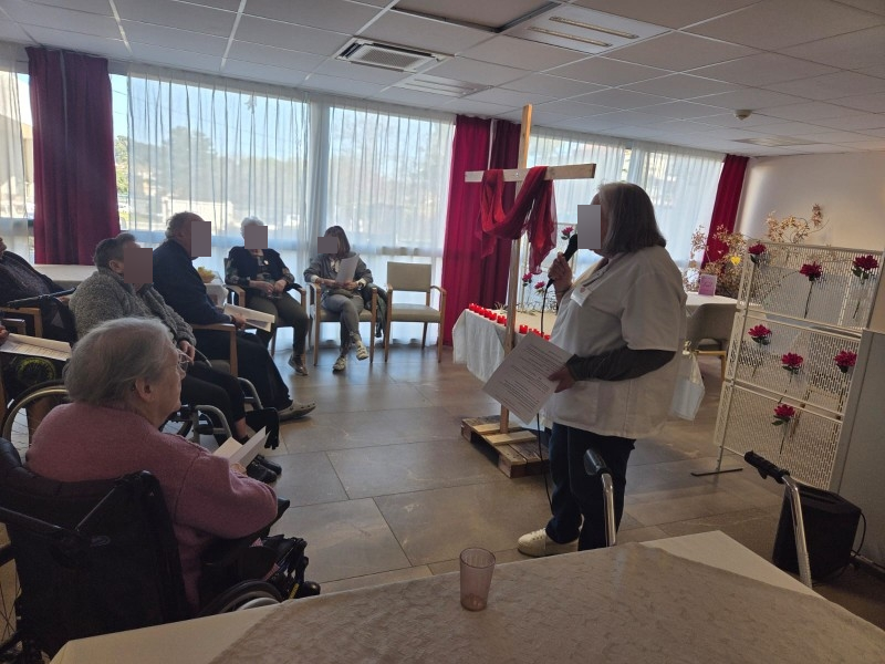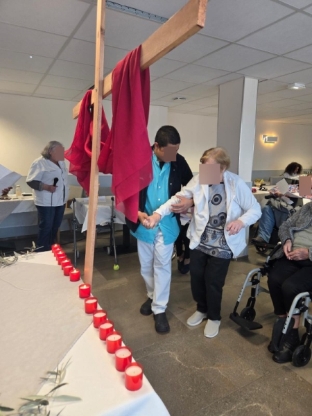 Dans ce silence empreint d’émotion, chacun pouvait méditer sur le sens de ce geste : les fardeaux de chacun, les peines, les inquiétudes et les souffrances étaient symboliquement confiés au Christ, portés avec Lui sur la Croix. Ce moment de recueillement a touché profondément les résidents comme les professionnels, offrant un temps de spiritualité intense et partagé.
