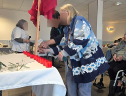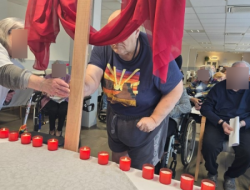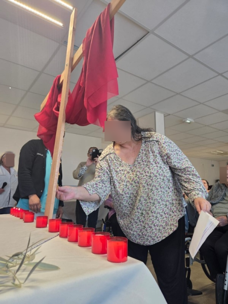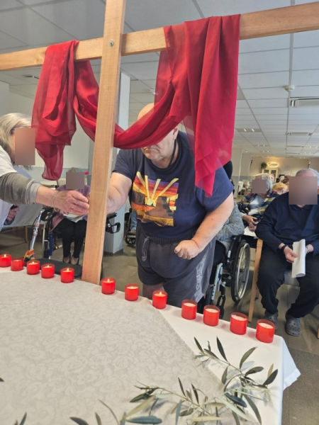 Un moment particulièrement fort a marqué cette célébration : chaque résident a été invité à coller une petite croix sur une grande Croix, symbole des épreuves, des pensées et des intentions déposées par chacun. Dans le même temps, une veilleuse était éteinte, geste simple mais profondément symbolique. Peu à peu, la lumière s’est faite plus discrète, jusqu’à laisser place aux ténèbres, annonçant le temps d’attente jusqu’à Pâques.